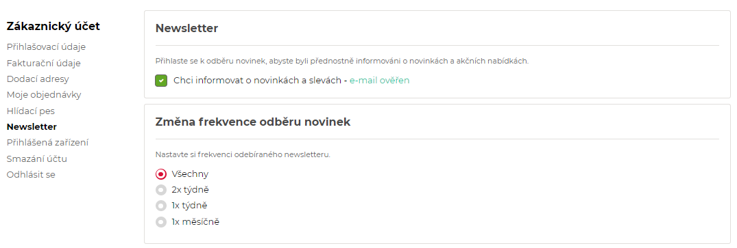 2. Aktivací v zákaznickém účtu: Pakliže jste již na webu registrováni, postačí se přihlásit do svého účtu a přejít do sekce Newsletter. Zde si zkontrolujete, zda je váš e-mail správně ověřen. Pokud vám slevy a novinky nechodí, zaškrtněte políčko Chci informovat o novinkách a slevách. Následně přejděte do své e-mailové schránky a ověřte správnost e-mailové adresy v příchozím e-mailu. Po potvrzení adresy bude odběr úspěšně dokončen.