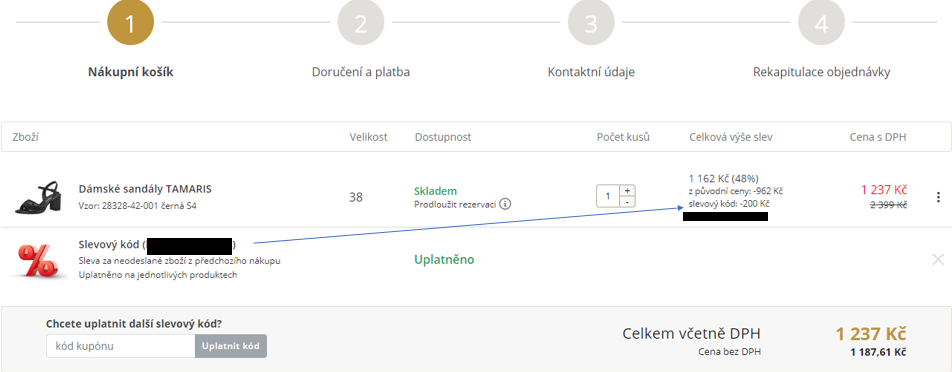 Kód, který obdržíte stačí pouze zkopírovat do pole „Kód kupónu“ a kliknout na „Uplatnit kód“. Sleva se vám automaticky promítne v košíku viz obrázek níže.