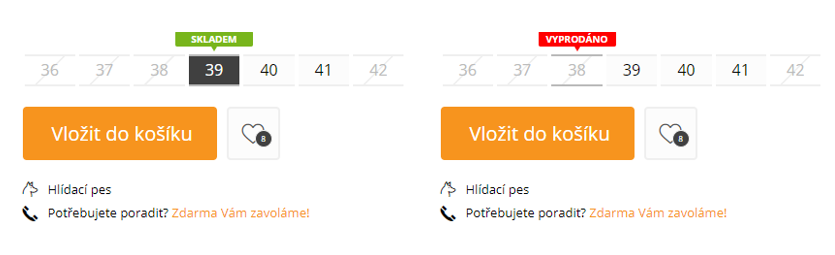 Zároveň pokud na dané číslo velikosti kliknete, zobrazí se „SKLADEM“, nebo „POSLEDNÍ KUS“ či „VYPRODÁNO“.