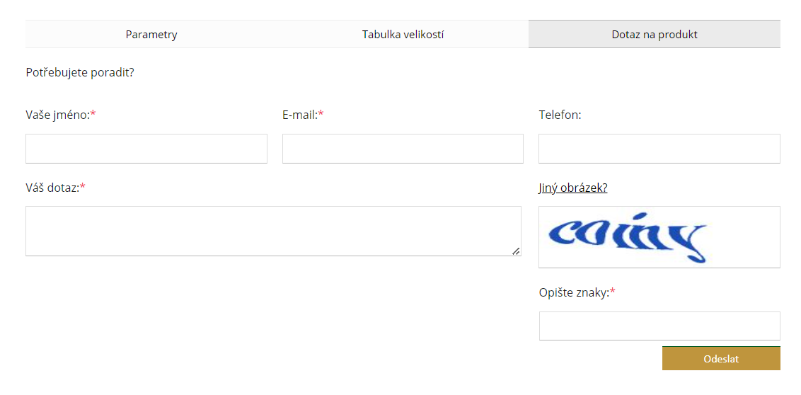 Zanechat vzkaz nám můžete přímo u produktu, který si prohlížíte. Pod popisem produktu naleznete 3 záložky: “Parametry”, “Tabulka velikostí” a “Dotaz na produkt”. Po kliknutí na záložku “Dotaz na produkt” se vám zobrazí kontaktní formulář, který jen vyplníte a naše zákaznická linka vás bude kontaktovat.